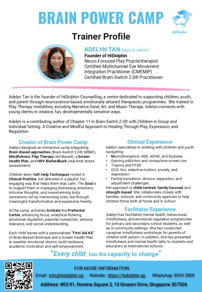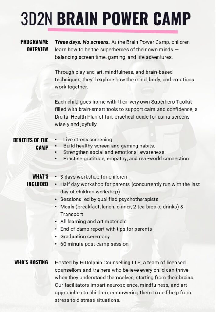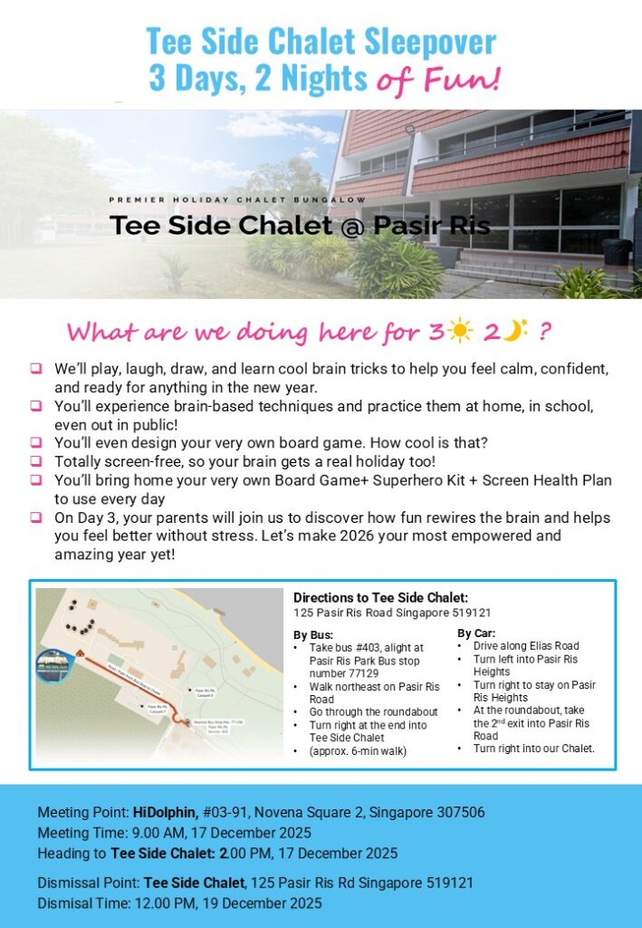 Hey P3āP6 boys and girls! Ready to power up your brain before 2026 begins? Join us, Ms. Adelyn and Germaine for a super fun 3D2N HiDolphin Brain Power Overnight Campš¬at Tee Side Chalet, Pasir Ris this December school holidays!